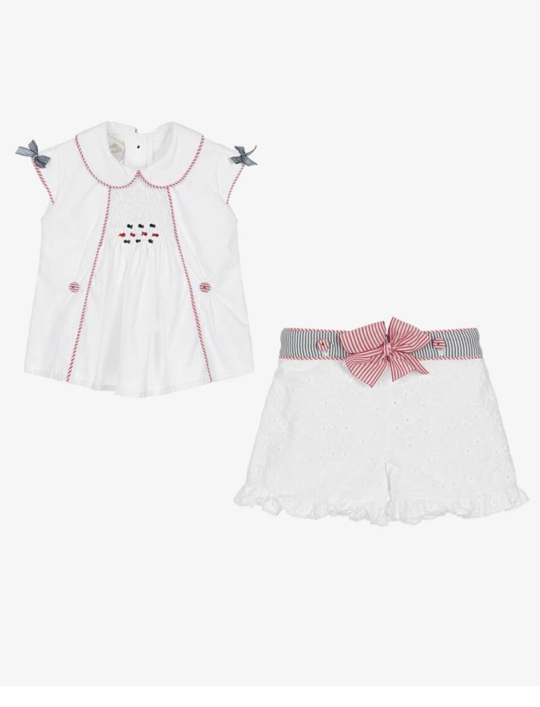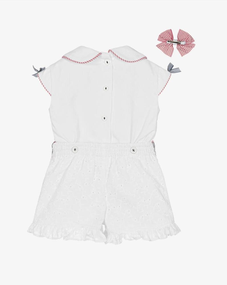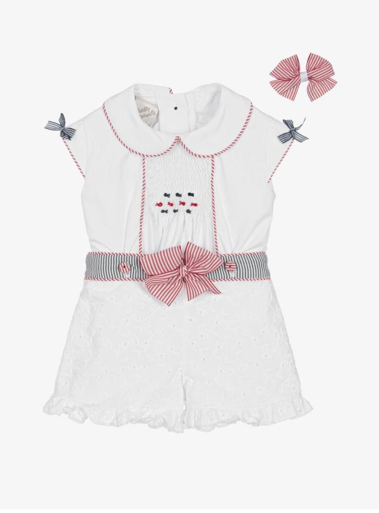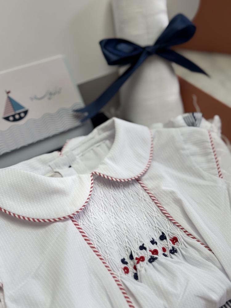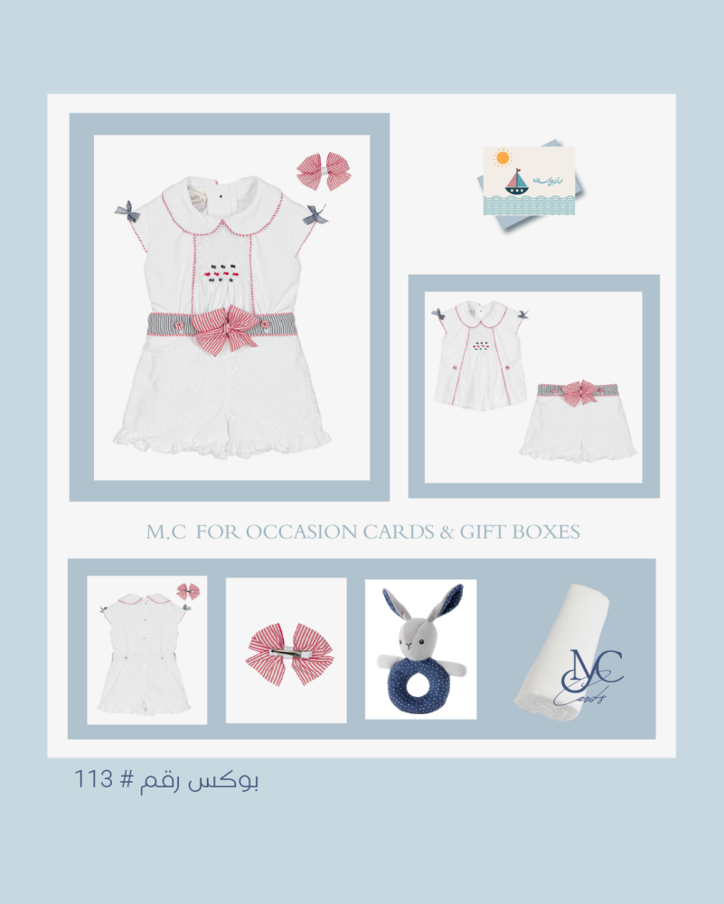 بوكس رقم #113 محتويات البوكس : - طقم بدلة رسمية مطرزة سموكنج قطن لون ابيض ( قميص + شورت + بكلة شعر ) - لفة ناعمة باللون الابيض -لعبة - بطاقة تهنئة مع ظرف تهنئة بالمولودة الجديدة من تصميم MC.Occasioncards